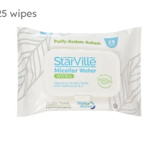 StarVille Hypoallergenic Antibacterial Purifying, Restoring & Refreshing Micellar Water Wet Wipes with Tea Tree Oil, Vitamins B3 & E for All Skin Types 25 wipes